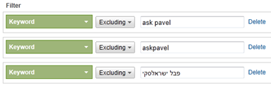 • Non-brand keywords – מעניין לבדוק כמה ביטויים שלא כוללים את שם האתר\מותג, מביאים טראפיק אורגני לאתר. תחת דוח keywords אפשר להגדיר פילטר עם exclude למילים הרצויות, לדוגמא: